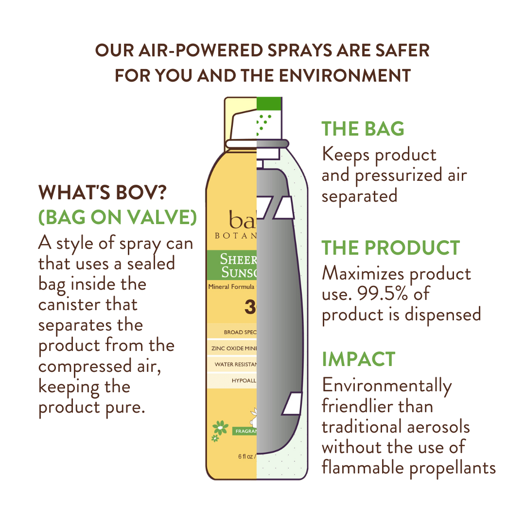 - Our bag-on-valve technology spray sunscreen uses compressed air, not flammable propellants like many traditional aerosols