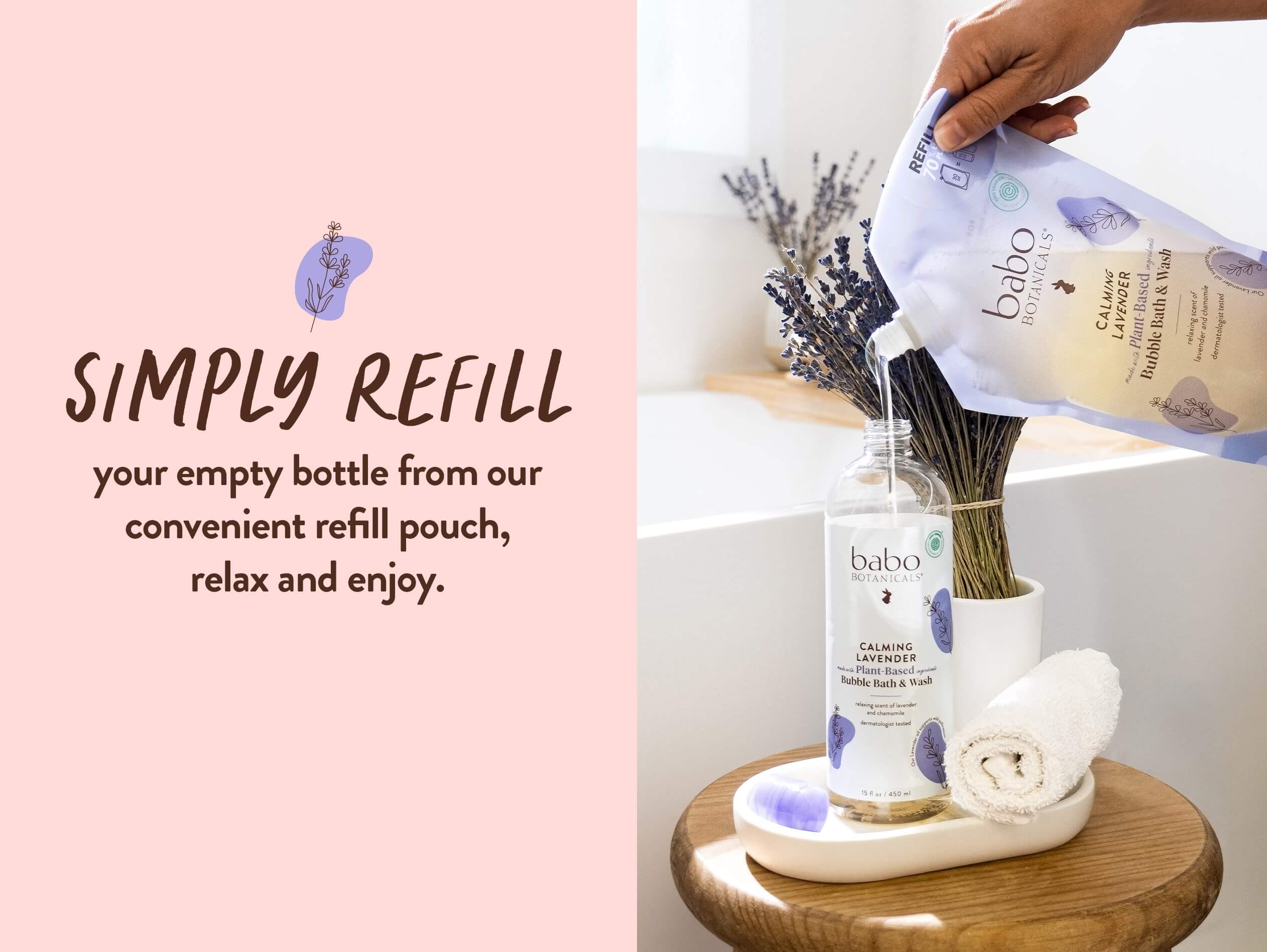- Step 2: Once the Bubble Bath & Wash bottle is completely dry, pour in the cleanser from the Refill pouch.