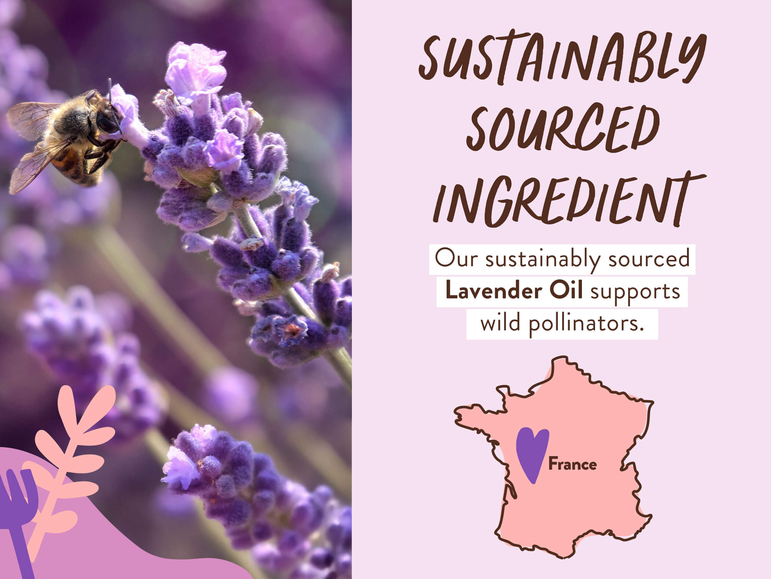 WITH SUSTAINABLY SOURCED LAVENDER OIL: Our certified fairtrade lavender is harvested from the south of France, where the fragrant flowering plant and other crops grown nearby like thyme and rosemary help attract bees and wild pollinators. Our calming, aromatic lavender is cultivated without the use of pesticides and insecticides to promote biodiversity. The local community is engaged in the gathering, drying, and extracting process, supporting families in the area and reducing environmental impact.