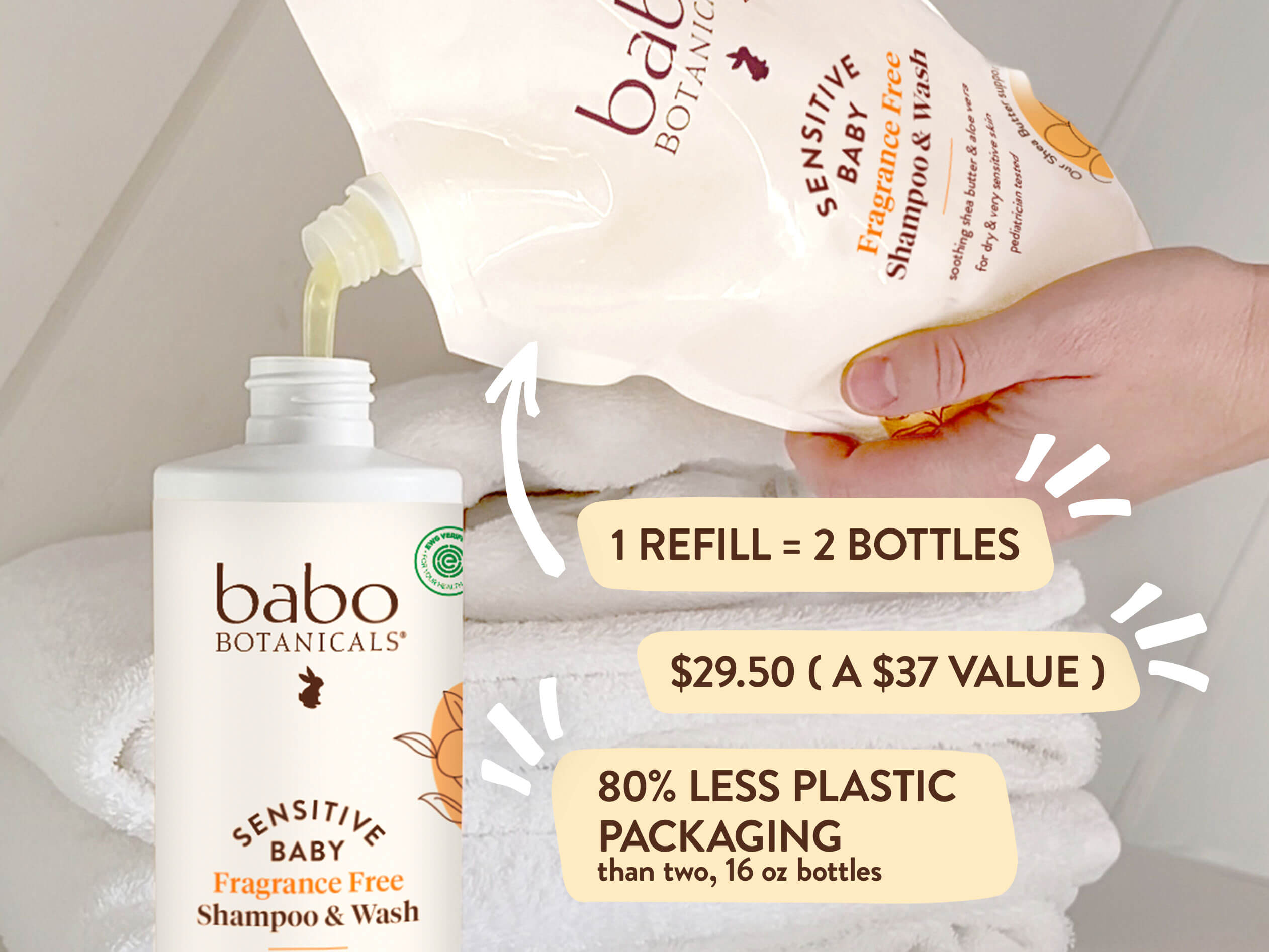 - This set includes our Sensitive Baby Fragrance-Free Shampoo & Wash – 16 oz Pump & 32 oz Refill Pouch