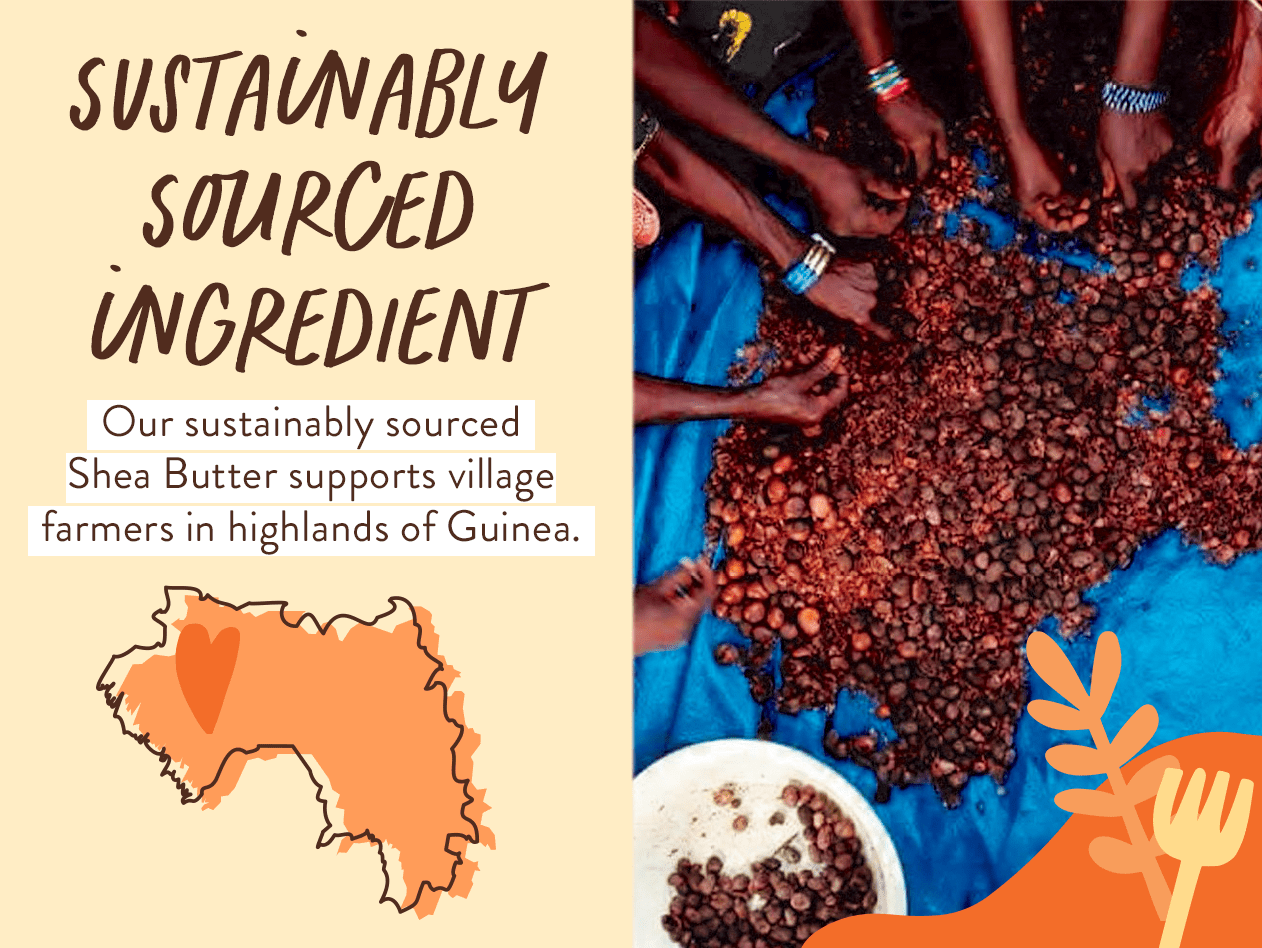 WITH SUSTAINABLY SOURCED SHEA BUTTER: We source our fair-trade shea butter from the mountainous highlands of Guinea in West Africa. Shea nuts are harvested by village farmers and locally pressed into a nourishing, unrefined shea butter well known for its hydrating and skin softening properties. Founded by the son of a Native Guinean, our provider uses the proceeds of the harvest to ensure farmers receive access to healthcare, education and a fair living wage.