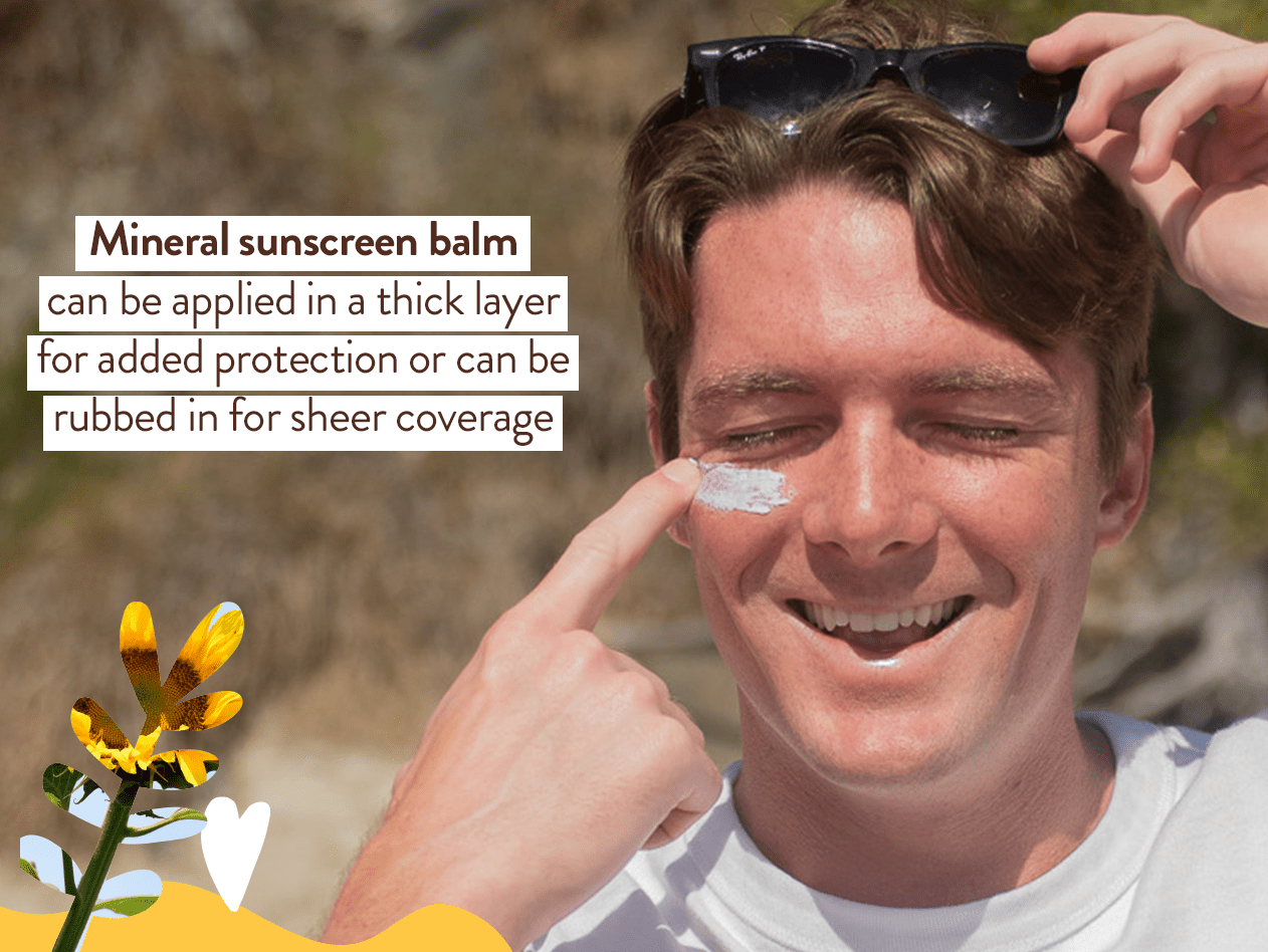 - Rich & creamy mineral sunscreen balm for face and high point areas of the face/body that need extra protection: nose, ears, lips, shoulders, tattoos, etc.