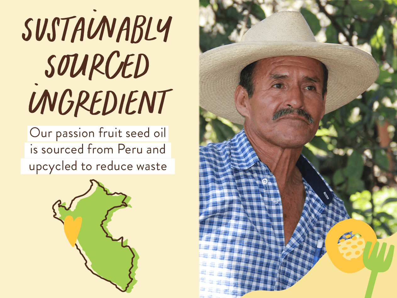 MADE WITH SUSTAINABLY SOURCED PASSION FRUIT OIL: We create our Passion Fruit Seed Oil by upcycling unused seeds sourced from farmers & juice makers in Peru. We salvage the seeds which are otherwise discarded and cold-press them into a nutritious vitamin-rich oil. This sustainable practice helps to promote a circular economy and provides an additional source of income for the local community who grows and harvests the Passion Fruit